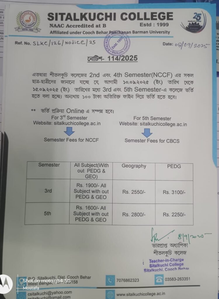 একইসাথে 3rd ও 5th Semester-এরও ভর্তি এই সময়ের মধ্যে সম্পন্ন করতে হবে। উল্লিখিত সময়ের পরে ভর্তি হলে ₹১০০ টাকা FINE দিতে হবে।
